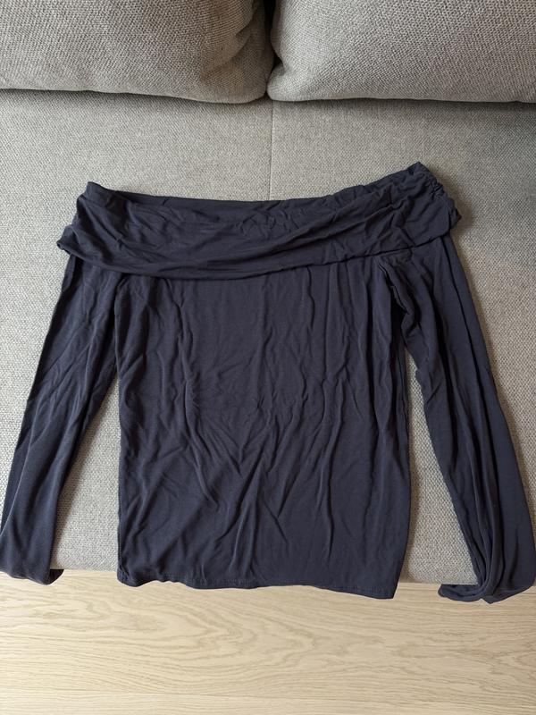 Сіра кофточка еластична, оголює плечі та ключиці, виглядає дуже жіночно