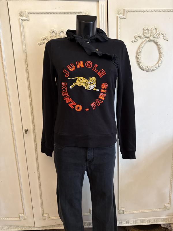 Колір чорний. Склад:котон-100/. Оздоблення:шовк/віскоза(50/50). KENZO X H&M. Цікава модель. Ґудзики у вигляді голови лева золотистого кольору. Розмір по бірці-S. Заміри: довжина-58 см, ПОГ-43 см, ПОГ-41 см, рукав-62 см. Стан ідеальний.