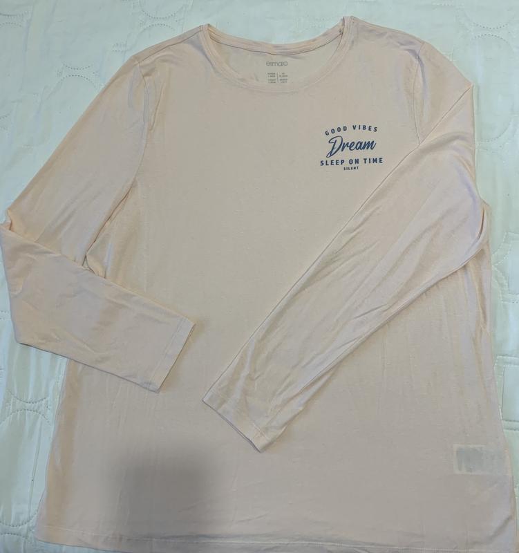Реглан (лонгслів) жіночій, для сну/дому. “Esmara” Розмір L(44/46 eur) НОГ-57см, НОБ-60см. Довжина реглану- 73см. Рукав-65см. Колір : персиковий відтінок основний, напис сіро-синій. 100% бавовна.