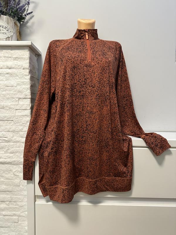 Стильна жіноча туніка вільного крою в теплій осінній палітрі. Матеріал м’який, приємний до тіла, добре тримає форму. Модель має високий комір-стійку з короткою блискавкою, що додає зручності та сучасного вигляду. Рукави довгі, з манжетами, низ виробу злегка подовжений з розрізами з боків. Колір — рудо-коричневий з чорним дрібним візерунком. Ідеально підходить для повсякденного образу, прогулянок чи відпочинку — комфорт і стиль в одному. Довжина 85,пог63