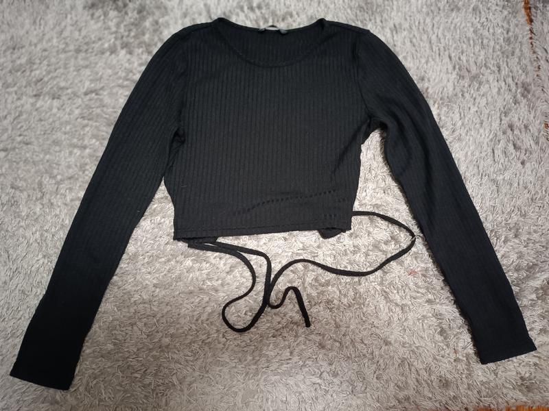 Красивый,черный в рубчик сзади на завязках на спине кроп-топ,реглан, лонгслив с длинным рукавом 🖤🔥