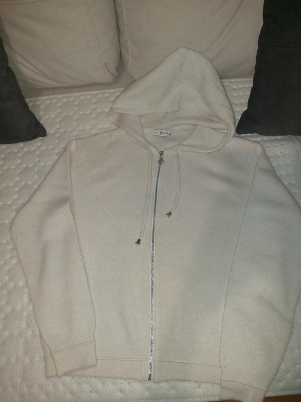 Кофта новая, на замке, с капишоном, очень приятная к телу, с люриксовой нитью, но не очень блестит. Размер М, состав: 30 хлопок, 5 люрекс, 65 РLMD.
