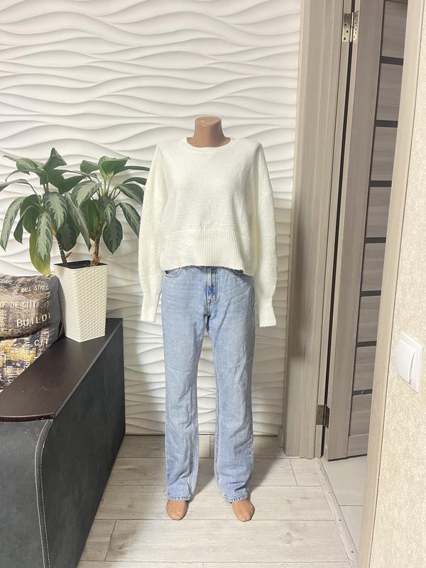 Біла в’язана кофта прямого крою з круглим вирізом, довгими рукавами та злегка вкороченою довжиною. Мінімалістична, м’яка на вигляд, добре поєднується з джинсами.