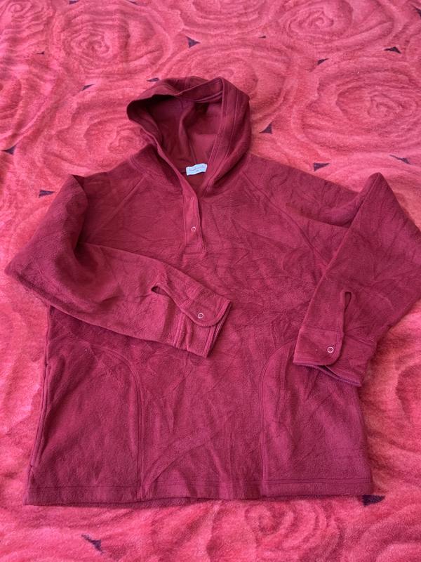 Фліска жіноча, в гарному стані, має бокові кишені і капішон, застібається на кнопки, дуже мягенька, тепла , приємна до тіла, рекомендую Заміри: ПОГ 50-55 Довжина 60 Рукав від шиї 68 По бірці розмір М