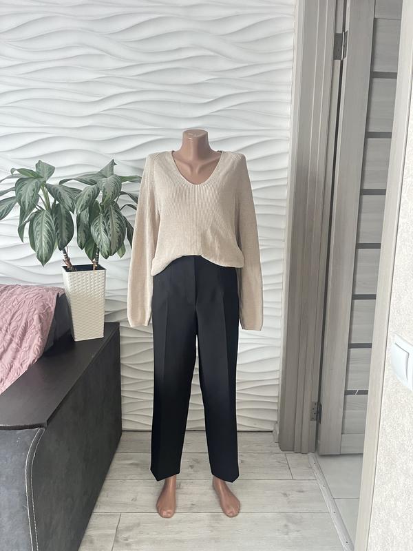 Бежева трикотажна кофта в рубчик із V-подібним вирізом. Має довгі рукави та вільний, злегка укорочений крій. Базова модель, що легко поєднується з різними образами.