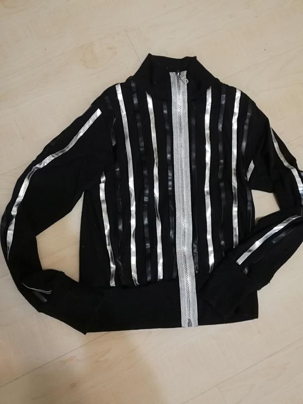 Модная чёрная олимпийка. Полоски настроены из кожи серебро и чёрные. Замок с люриксом серебро. Пог 47,Пот 39,длинна с воротником 61. Реглан дополнительно по размеру немного тянется.