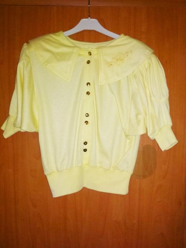 Необыкновенная кофточка! Цвет нежно жёлтый, резиночки на пояске и на ручках. Пугвички золотого цвета. Фасон летучей мыши. Размер не указан. Замеры: длина 55см, пог 42см.