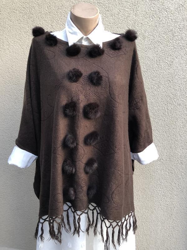 Кофта,кашемировое пончо,реглан,этно,бохо стиль,бахрома,трикотаж с меховыми помпонами