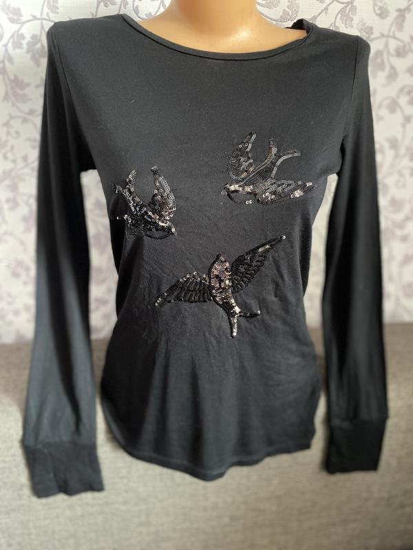 Очень красивая кофточка, очень приятная к телу с красивой аппликацией из паеток в форме птичек. Не носилась - сток.