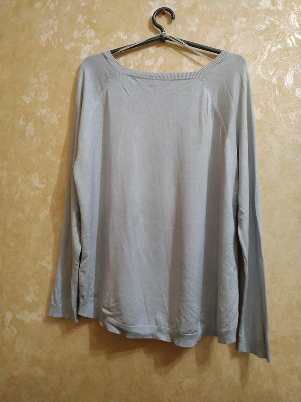 Светр вільного крою з комбінованих матеріалів: перед виконаний з шифону (поліестер), а спинка і рукава з трикотажу (віскоза - 85%, поліамід - 15%) У зв'язку з умовами продажу на Шафі (15% від вартості, але не менше за 10 грн), речі з маленькою вартість продаються за умови придбання на загальну суму від 70 грн