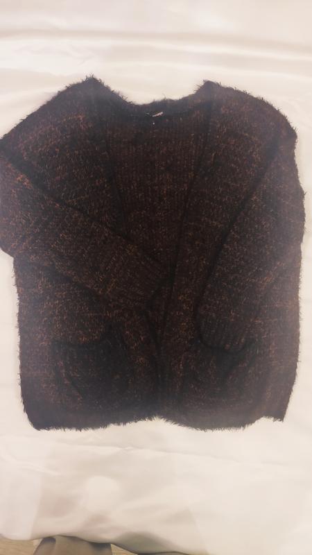 Кофта-кардиган.Меланж чорно-коричневий,нитка ''травичка'' з невисоким ворсом.Відомий бренд .Розмір англ.16 європейський 44.ПОГ між проймами 60+ см Довжина рукава 44см,занижена лінія плеча. Ширина в плечах 60см. Довжина 60-62см