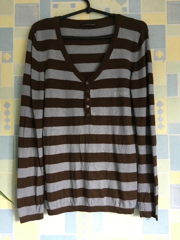 Мягкий джемпер в полоску, с V-образным вырезом. Цвет полосок - серо-голубой и коричневый. Надпись переливающимися стразами. Было в носке, стала мала. В цене учтено. Состав - 92% вискоза, 8% - эластан. Размер S-M. Маркировка неверная. Ширина от подмышки до подмышки - 44см Ширина на уровне талии - 40см Ширина по уровню бедер - 44см Высота от уровня плеча - 65см Рукав от плеча - 64см