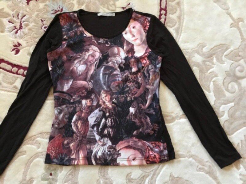 Класний реглан виробництва Греції, розмір 34 вказано, перед з принтом з поліестеру, а решта з віскози і еластану. Зо два рази школярка оділа. Довжина- 51см, плечі- 36см, рукав від плеча-56см, пог- 43см.