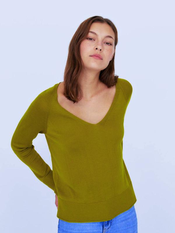 Джемпер яркого оливкового цвета с V-образным вырезом, размер L или 48, фирма Stradivarius, 100% oригинал!!! Внизу по бокам есть разрезы, манжеты в рубчик, лёгкий, элегантный. Замеры: Длина изделия 64 см. Длина рукава от ворота 68 см. ПОГ 47 см. ПО внизу 49 см. Длина разреза 8,5 см. Состав: 44% акрил, 54% вискоза, 2% полиэстер.