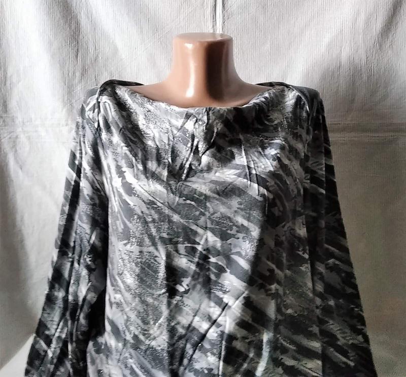 Натуральний,з легким сріблястим шимером.Комір-хомут,сучасний абстрактний принт. Всі виміри зроблені в спокійному (не розтягнутому) стані. ФОТО НА ТІЛІ НЕМАЄ. Довжина(по спині) 71 Завширшки(пахви) 60