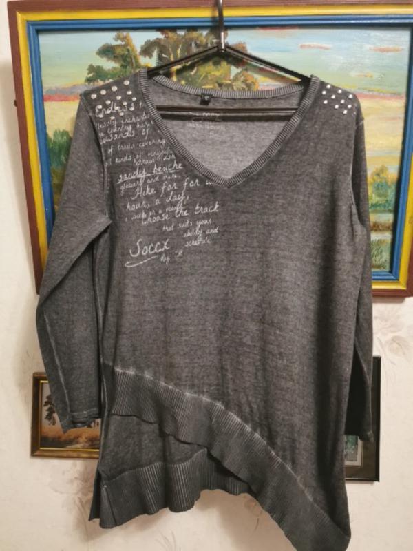 Красивий, неординарною, реглан, светрик, Розрізи з боків 12 см, асиметричная Довжина, Рукав 3/4,гарно сидить особливо під джинси скіні, в хорошому складі бавовна 80%,20%вовна,в стилі John richmond. Плечі 44 Рукав52 Груди 48 Довжина 68-77 Реглан не носився