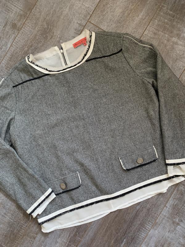 нова, без паперової бірки стильна кофта, заміри на фото ззаді замок знизу шифон на всю площу тканина не тягнеться, схожа на костюмну, але тонша.