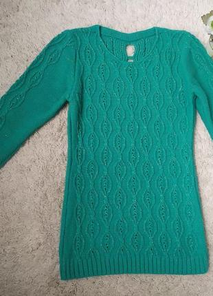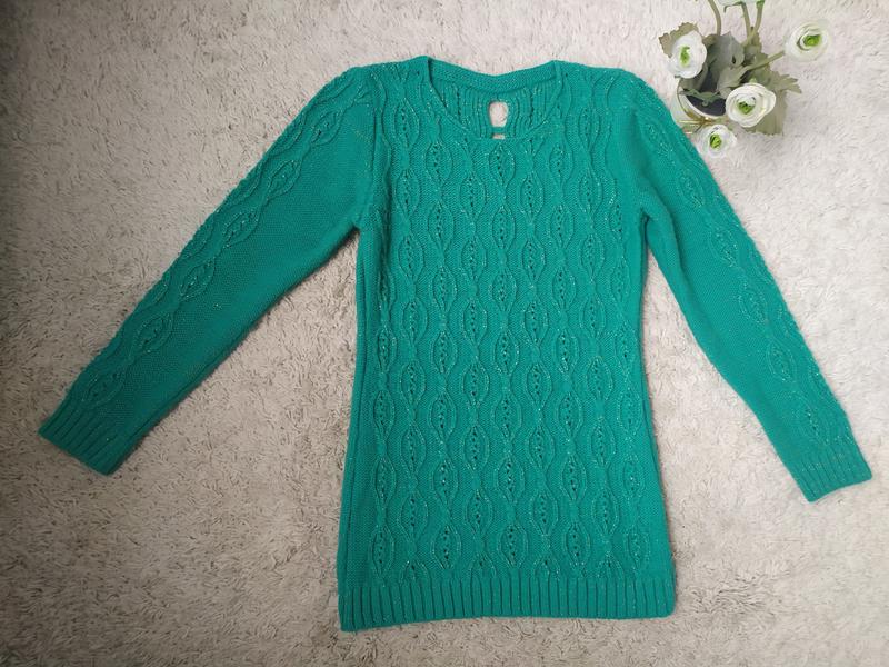Продам женский свитер б/у, в отличном состоянии. Мягкий и приятный на ощупь, довольно плотный и теплый, бирюзового цвета. Длина по спинке -66 см. длина рукава-59 см.ПОГ-44 см.Хорошо растягивается в ширь По пряже проходит люрексовая золотистая нить.