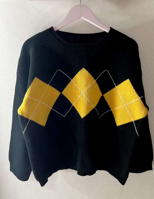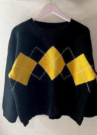 Той самий трендовий пуловер із Pinterest, який виглядає стильно та дорого! Об’ємна модель oversize, щільна в’язка, ефектне поєднання кольорів — чорний + жовтий, що додає образу виразності та сучасності. Стан: ідеальний, без дефектів Розмір: one size • ПОГ — 61 см • Довжина — 60 см Особливості: • модний фасон oversize • щільна якісна в’язка • геометричний принт • трендовий вигляд у стилі Pinterest / Korean fashion • ідеально пасує до джинсів, шкіряних штанів чи спідниць