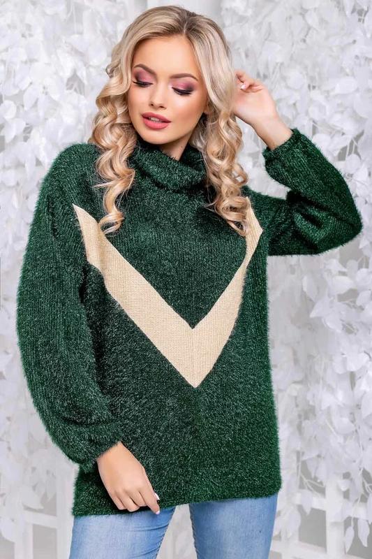 В новой осенне-зимней коллекции Аngora elite есть уникальная стильная новинка нарядный свитер насыщенного зеленого цвета. Модель имеет эксклюзивное оформление в виде v-образной контрастной вставки-полосы на палочке. Благодаря ее теплому и приятному кофейному оттенку образ становится более женственным и элегантным. Еще одним интересным дополнением модели стали приспущенные втачные рукава и нетривиальный фасон в виде небольшого кокона. Для пошива модели от производителя использована очень мягкая и приятная к телу ангора, которая хорошо согревает в любую погоду предстоящего осенне-зимнего сезона. Дизайнеры интернет-магазина ST-SEVENTEEN использовали стильную объемную горловину в виде хомута. Модель отлично подойдет для праздничного, молодежного, повседневного и креативного спортивного образа.