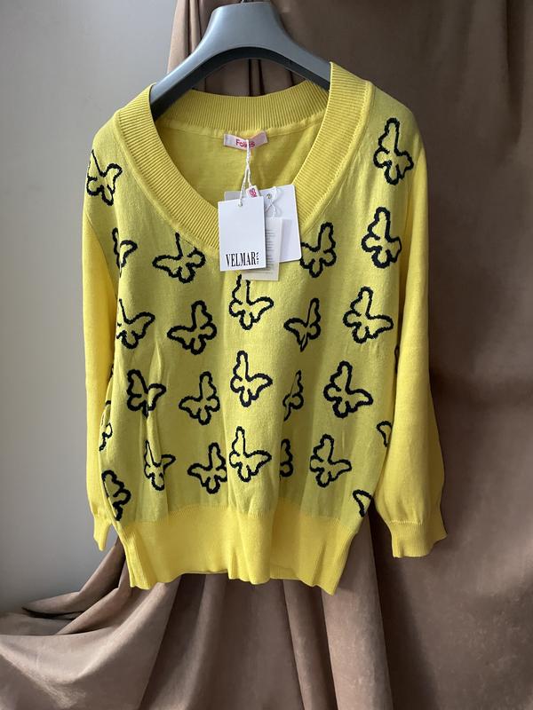 Походження: Це італійська лінія одягу, що входить до групи брендів Blufin, куди також належить головний бренд Blumarine. • Коли з’явилася: Бренд Blugirl (основна лінія) був заснований у 1995 році Анною Молінарі як більш молодіжна альтернатива Blumarine. Светр Blugirl Folles, M/L, лимонно-жовтий, метелики синього кольору, зроблений в Італії, бавовна 100%, рукав три чверті, ззаду металлич лого, м'який та приємний Довжина-57 Довжина рукава-48 Довжина рукава від пройми-33 ПОГ-45 Ширина плечей-37