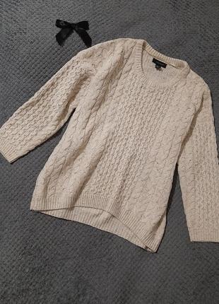 Светр у кольорі беж з ажурною в'язкою, дуже теплий і комфортний. Ідеальний варіант для осені! Гарно підходить під будь-який стиль одягу. Попереду - в'язка косами, на спинці проста в'язка. Розмір 12 За додатковими питаннями і замірами звертайтесь у повідомлення.