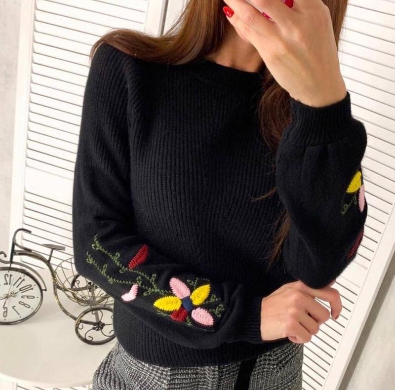 Светр з вишивкою Модель: 6463 Розмір: універсальний (42-46) Тканина: машинне в'язання Кольори: чорний, сірий, м'ята, капучино, гірчиця, білий, пудра, смарагд, блакитний, фіолетовий
