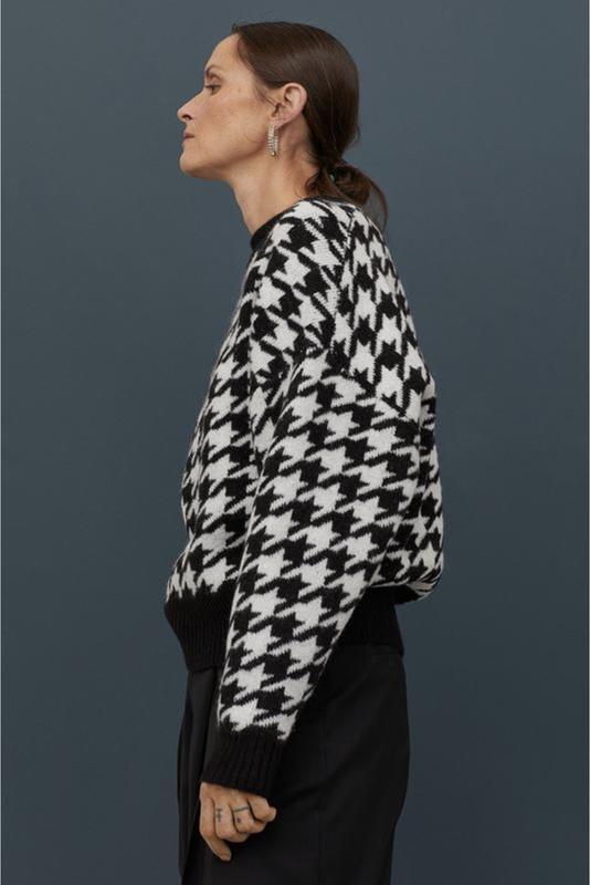 Свободный свитер в принт "гусиная лапка" 52% полиэстр, 41% акрил, 4% шерсть, 3% эластан Стан - идеальный Размер М Полуобхват груди - 62 см Длина рукава от горловины - 75 см Длина кофты - 61 см