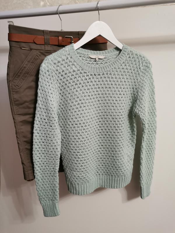 Тёплый джемпер пыльно-бирюзового цвета. Заміри в спокійному стані: Довжина по спині 60 см. Ширина плечей 36 см. Довжина рукава 65 см. Напівобхват грудей 43 см, талії 40 см, знизу 36 см. Спідниця, яка на фото, продана.
