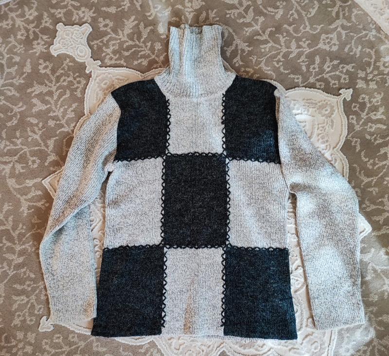 Сіра кофта гольф в’язана. Розмір М. Довжина 60,5 см, довжина рукава 57 см, ширина плечей пів обхват 41 см, пів обхват грудей 50 см. Тягнеться.