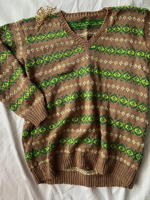 В'язаний светрик ручної роботи 🙌🏻 Тепленький та дуже атмосферний, у затишних кольорах 🌿 Приємний до тіла 💫 Розмір: s-m Довжина: 69 см Півобхват грудей: 54 см Рукав від горловини: 75 см