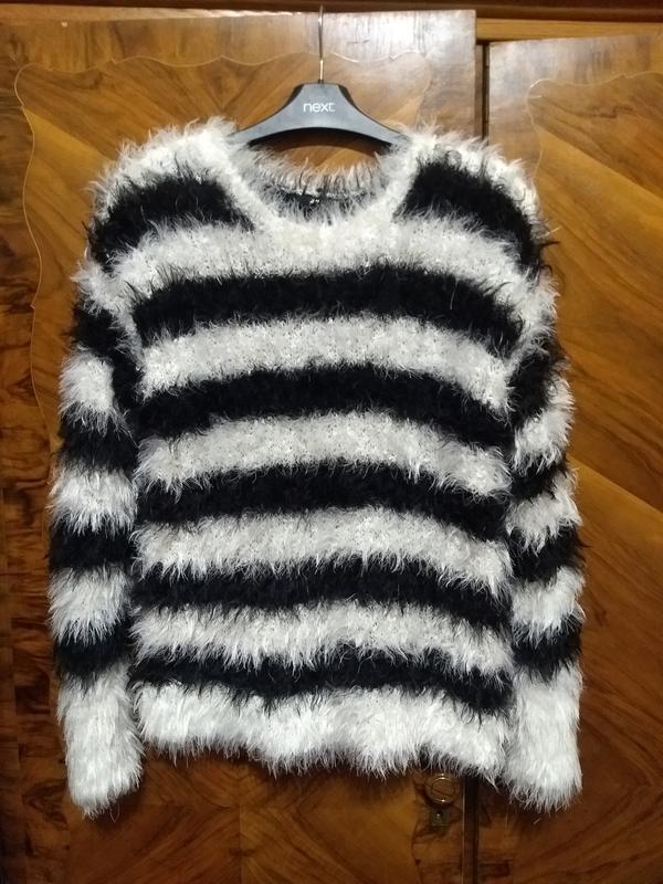 Пухнастий, об'ємний, м'який светр в чорно-білі смуги H&M. На бірці розмір S, але добре сяде і на М-ку, так як він вільний і добре тягнеться.