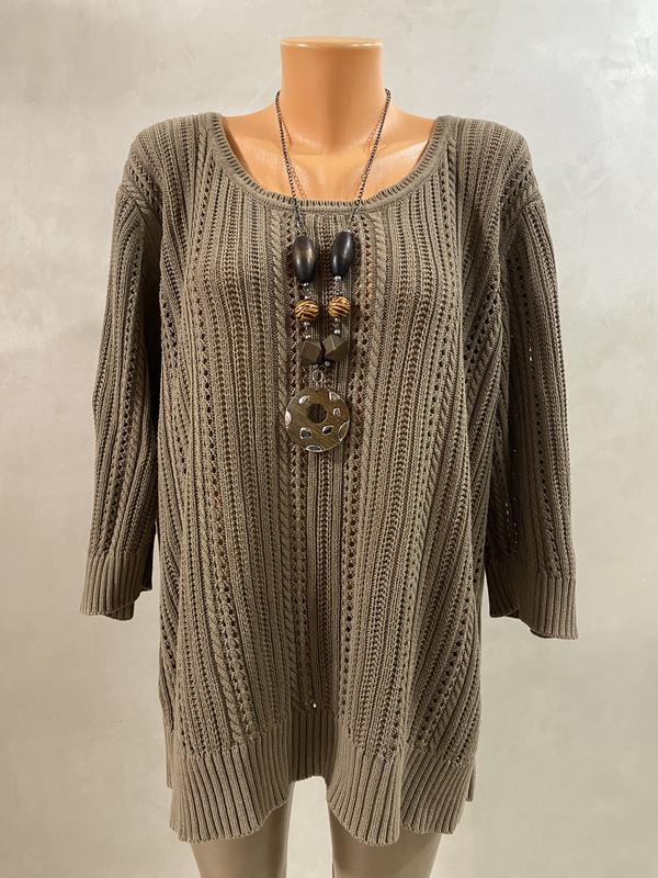 Фото на тілі нема Фото на маникені Воротник круглий Рукави трьохчертвертні Фасон вільний В’язка заводська Розмір великий але можна носити і як оверсайз оріентуйтесь по замірам Довжина 68 см) Плечі 50-51 см) Пог 67 см) Пот 60 см) Знизу 62 см) Рукав 44,5 см)