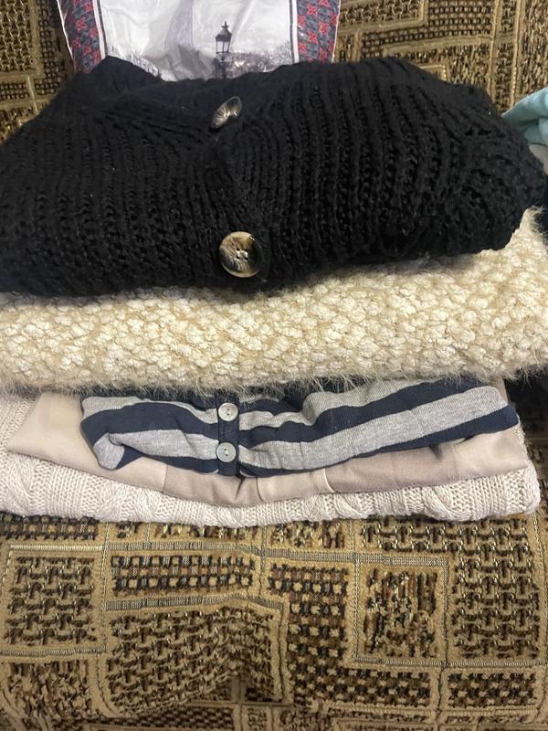 У лоті: кофта на ґудзиках, светр, в‘язане плаття (знизу), туніка та полосатий лонгслів, можна придбати окремо