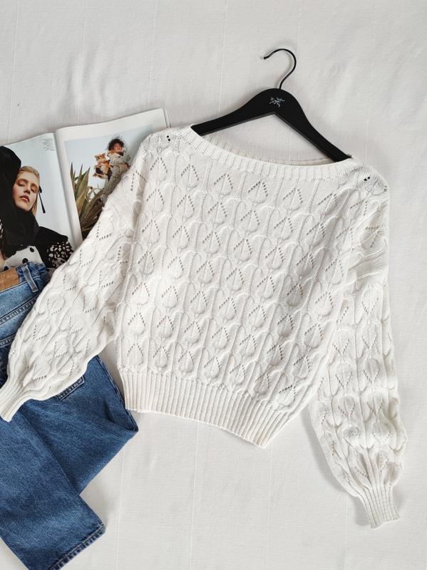 🌿білий светр красивої в'язки від Only Розмір:S Заміри:ПО грудей 50 см, довжина 51 см, довжина рукава від горловини 70 см Склад:70% котон, 30% поліестр