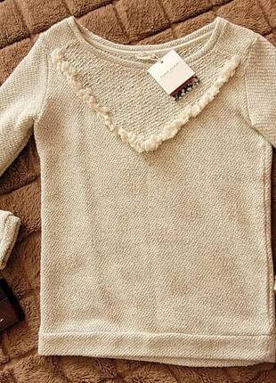 Ніжного бежевого кольору (на фото насиченіша) з люрексовою ниткою. Заміри: Довжина -59 см, ширина під руками -44 см, рукав від плеча -60 см.