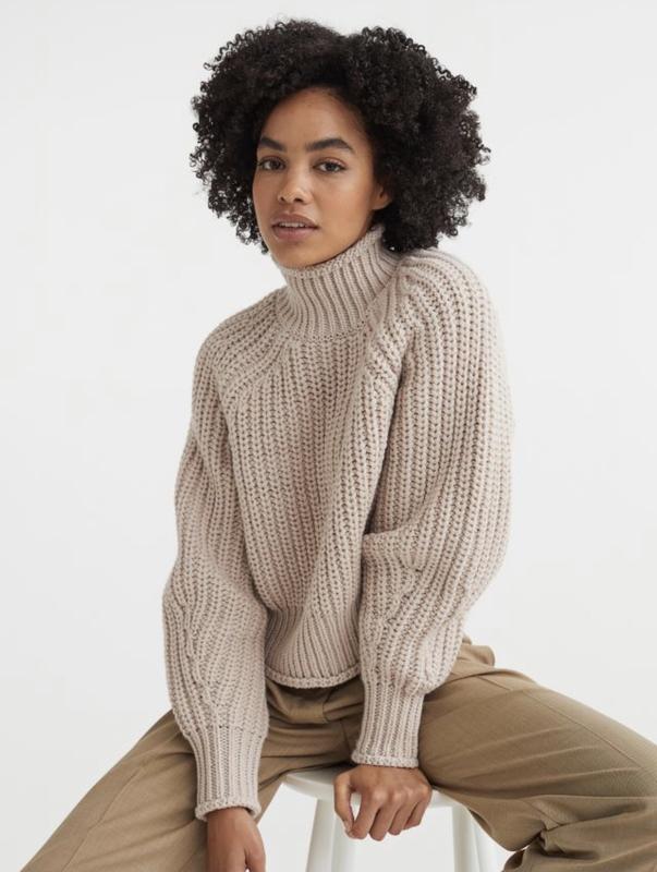 Светр прямокутної форми з суміші вовни мокрої в’язки. Комір-водолазка з підгорнутим краєм, широкі рукави реглан. Рукава і низ светра в широку рубчик з підгорнутим краєм. Склад: поліестер 50%, акрил 45%, шерсть 5%