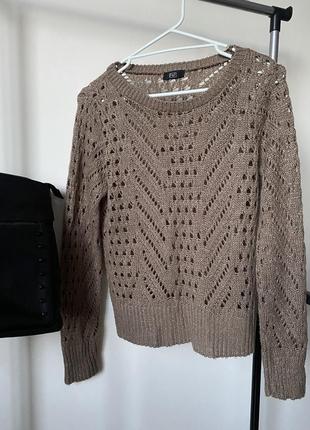 В’язана кофта в гарному стані, тягнеться. Колір кофейний з золотою ниткою. Гарно дивиться як до джинсів так і до спіднички, або на плаття) Довжина - 55 см Пог - 44 см Рукав від плеча - 62 см Плечі - 36 см