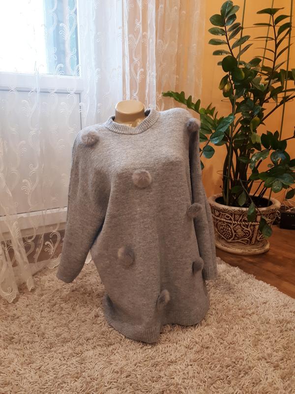 Теплющий светер відомого бренду.Практичний і комфортний.Оздоблений бомбончиками з хутра.Модель оверсайз. В чудовому стані, без нюансів. Довжина 75 см ПОГ 60см(має бути вільно) Довжина рукава від горловини 70 см