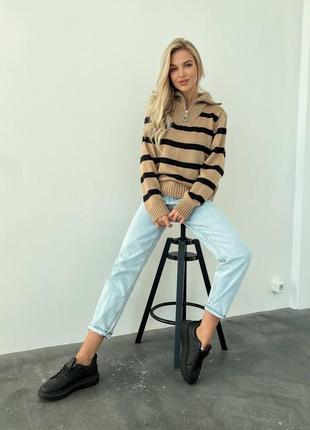 Дуже стильний светр зі смужками в гарних поєднаннях із вовняної нитки з молнією на горловині ▪️2047 🌿 ▪️Склад: 50% вовна, 50% акрил (Марс) ▪️Кольори: Кемел-чорний Рожевий-чорний Молочний-блакитний Кемел-молочний Молочний-чорний Молочний-помаранчевий ▪️Розмір: 42-46 🏷 Ціна: 890 грн _