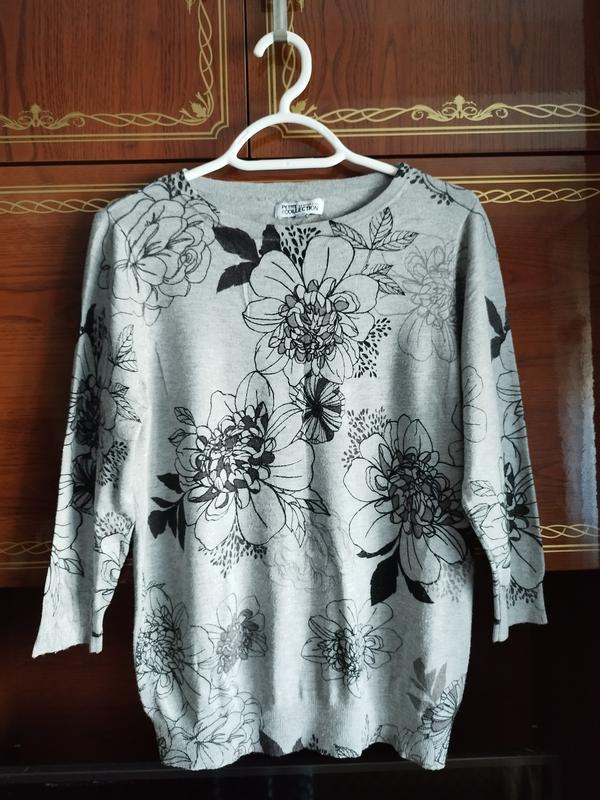 Светр на розмір 44-46,плечі 34 см,пахви 45 см,довжина рукава 43 см,довжина 58 см.