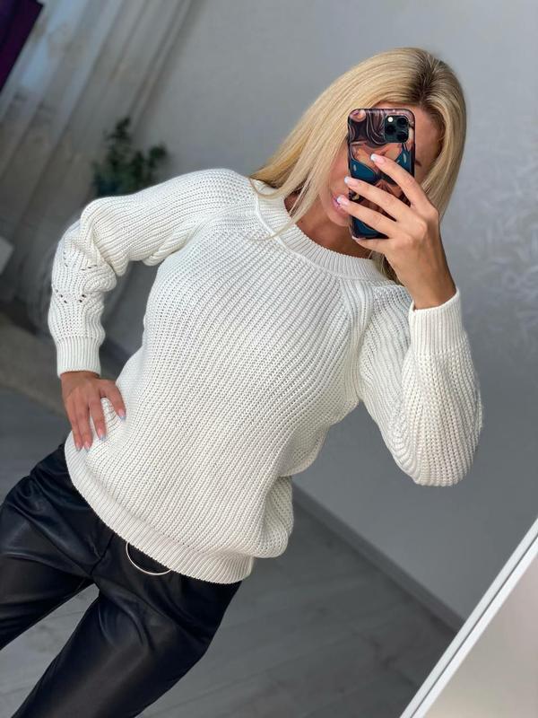 Светрик Модель 5018 Розмір універсал 42-48 Склад 30% акрил, 70% вовна Кольори: джинс, зелений, лаванда, молоко, пудра Заміри виробу в лежачому стані: - довжина 60 см; - ширина 48-56 см; - довжина рукава від горловини 67 см MODN