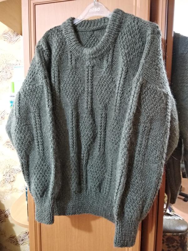 Светр, розмір м, гарного темно оливкового кольору, на жаль фото не передає цей колір, рукава приспущені, бірки не має. У відмінному стані. Дуже теплий.