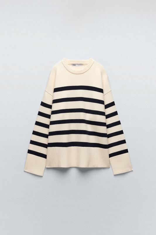Молочный свитер В темно синюю полоску Удлиненный рукав По бокам разрезы Размер по бирке М Отлично садится от XS-M