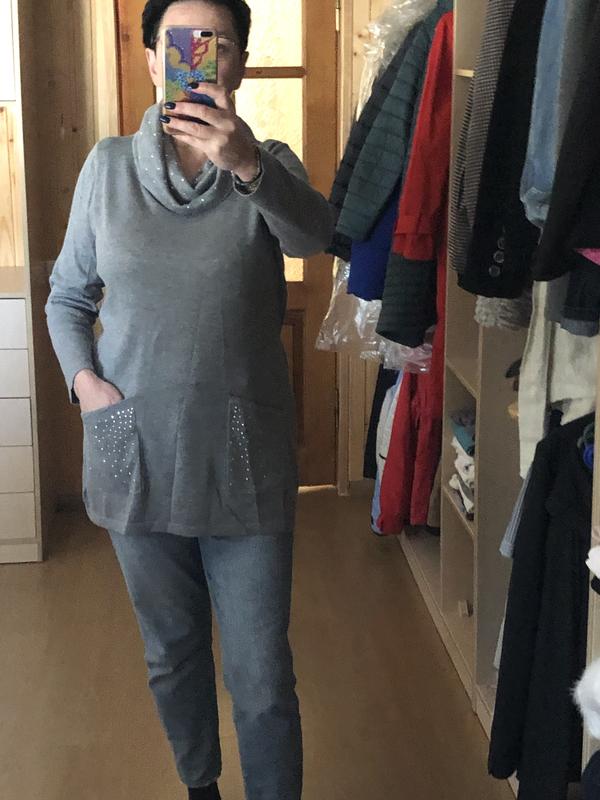 Гарна.Немає плям,дірок,затяжок чи закашлачень.Має пасок.Є дві кишеньки.На горловині і на кишеньках є прикраси в вигляді ніби цвяшків.Заміри:півокружність грудей 55 см,довжина 84 см,довжина рукава 62 см.За допомогою паска чудово можна підкреслити талію.Особисто я зав‘язувала його ззаду.Річ стильна і неповторна.