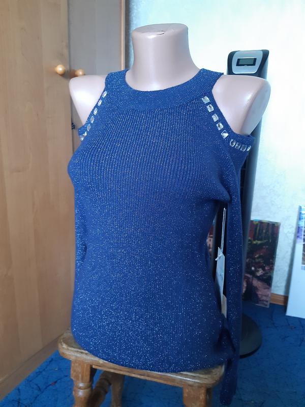 Тонкий женский свитер с открытыми плечами. Материал с люрексом (блестит). Состав материала: шерсть 75%, кашемир 10%, спандекс 15% Размер L-XL (46-48) полуобхват 37 см длина от горловины 58 см