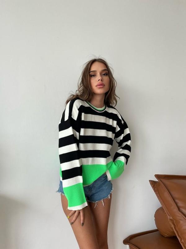 Молодіжний светр, машинна в'язка. Виробництво Туреччина. Підійде на розмір 44-46, на не високий зріст. Довжина светрика 53 см, довжина рукава від горловини 61 см, ПОГ 49 см. Тягнеться хорошо. Склад: 100% акріл.