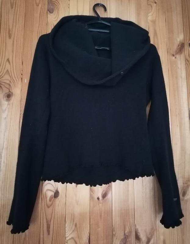 Укороченный шерстяной свитер с объемными воротником - капюшоном. Теплый и приятный к телу. Длина - 50 см., рукав от ворота - 69 см., ПОГ - 46 см., ПОТ - 40 см., ПОБ - 45 см