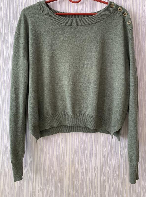 Укорочённая модель оверсайз со спущенной линией плеча Бренд: Inhabit Состав: 100% кашемир Состояние - очень хорошее, есть нюанс зашитое место спереди внизу (показала на фото) Размер: S ПОГ 47 см Длина 43 см