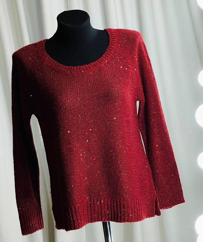 Свитер с пайетками терракотового цвета ТМ ART. 9🛍❤️🔥😍😍😍 Размер - М / 44-46 ( и легко пойдет и на L ) . Состав: 50% полиэстр, 48% акрил, 2% другие материалы . Свитер связан изнаночной гладью из пряжи с пайетками . Рукава реглан . Широкая горловина , по краю узкая трикотажная резинка . Рукава и низ с резинкой по краю , по бокам резинки низа - разрезы. Отлично тянется . Хорошего качества. Дополнительные замеры: полная длина 58 см , длина рукава- реглан ( замер от линии горловины до края рукава ) 67 см, полуобхват груди 50 см ( полный обхват 100 см) и потянется до 120 см, полуобхват талии 50 см ( полный обхват 100 см) , полуобхват бедер 50 см ( полный обхват 100 см) и плюс разрезы боков .